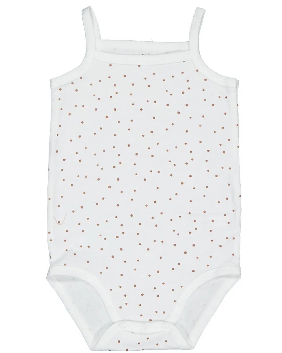 Cet ensemble est composé de deux bodies pour bébé : un marron et un blanc avec de petits pois. Les bodies ont de fines bretelles et pas de manches, pour que les bras puissent bouger librement. Ils sont en coton, ce qui rend le tissu doux et respirant sur la peau. Les couleurs douces donnent un aspect naturel.