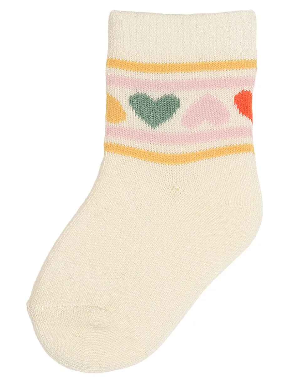 Cet ensemble de cinq paires de chaussettes pour bébé beige est fabriqué en coton, polyester et un peu d’élasthanne. Le tissu est doux et légèrement extensible, ce qui les rend agréables à porter. Chaque chaussette a un motif de petits cœurs de différentes couleurs, pour un effet simple et ludique. Les bords tiennent bien en place, pour que les chaussettes restent aux pieds et gardent les petits pieds au chaud.