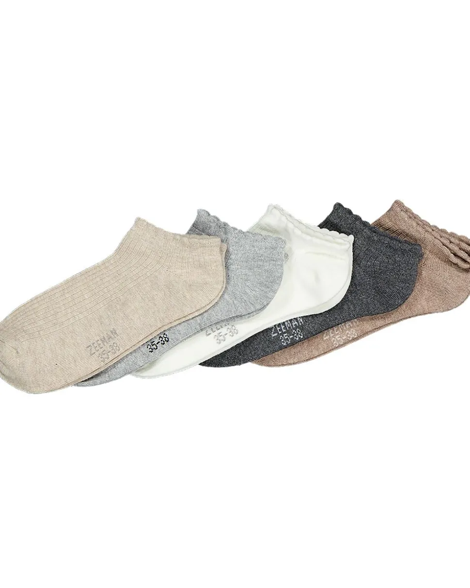 Ce lot de 5 chaussettes pour femme est proposé dans des couleurs neutres comme le beige, le gris et le gris foncé. Les chaussettes sont coupées bas, elles restent donc à peine visibles dans vos chaussures. Grâce à la forte teneur en coton, elles sont douces et laissent bien passer l’air. L’élasthanne permet aux chaussettes de bien épouser le pied et de rester confortables.