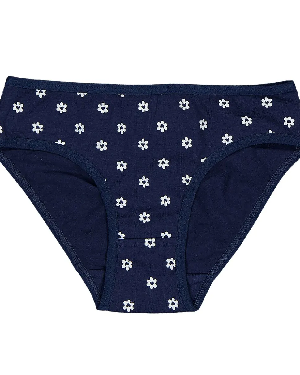 Cette culotte Dani pour fille est vendue par lot de 4, dans les coloris bleu clair et bleu foncé. Certaines culottes sont unies, d’autres ont de petits imprimés de fleurs. Le tissu est composé de coton, polyester et élasthanne, ce qui le rend doux et légèrement extensible. La taille élastiquée maintient la culotte bien en place, sans gêner les mouvements tout au long de la journée.