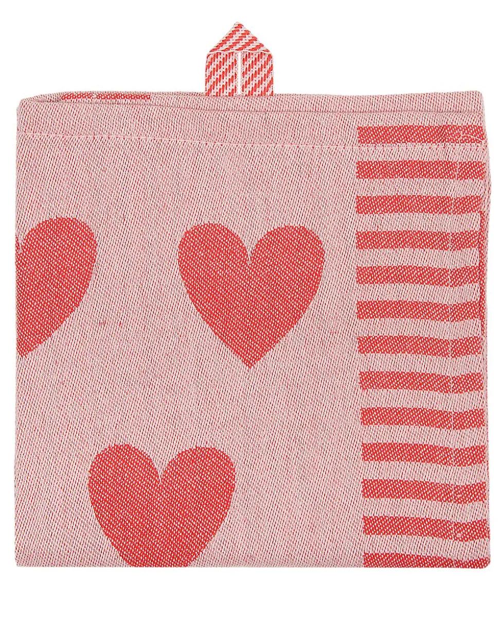 Ce torchon rose est fabriqué en 100 % coton et a une structure tissée, ce qui lui donne une tenue solide. Les grands cœurs et les fines rayures apportent une touche joyeuse à votre cuisine. Grâce à la boucle d’attache, vous pouvez le suspendre facilement pour l’avoir vite sous la main quand vous faites la vaisselle.