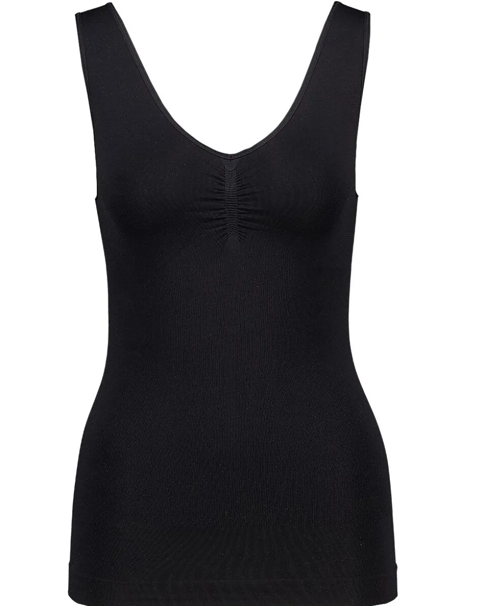 Ce haut noir a de larges bretelles et une encolure ronde et profonde. Le tissu est en polyamide avec de l’élasthanne, ce qui lui donne une tenue ferme et un bon ajustement. Le haut tombe bien le long du corps, ce qui permet de le porter facilement sous des vêtements près du corps. Les sous-vêtements sculptants lissent un peu le ventre, les hanches ou les jambes et ont un effet gainant. Vous pouvez les porter sous une robe ou un pantalon ajusté, par exemple.