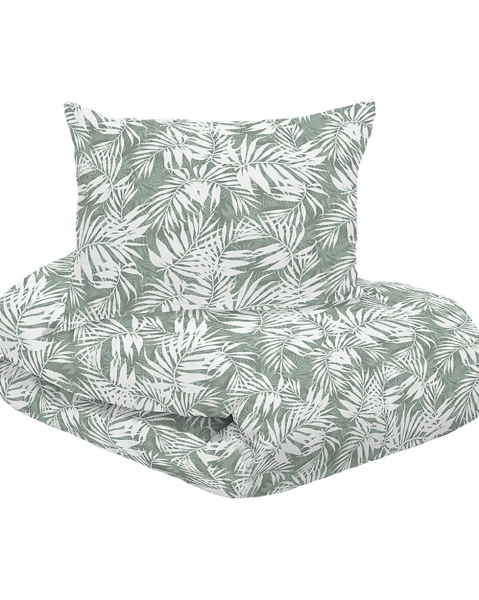 Cette parure de lit verte présente un imprimé de feuilles blanches. Le tissu léger retombe joliment autour du lit, conférant à votre chambre une allure sobre et naturelle. Grâce à ses dimensions généreuses, la housse de couette reste bien en place et recouvre aisément un lit deux personnes. Faire son lit n’a jamais été aussi facile.