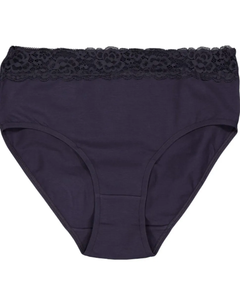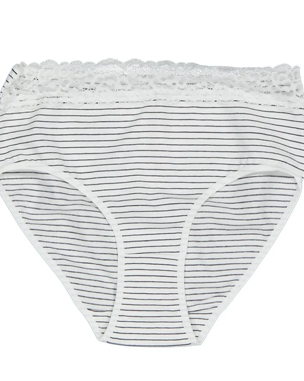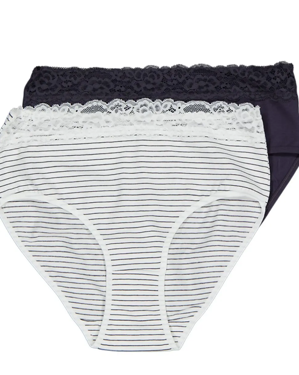 Ces hipsters Jane pour femme sont vendus par deux : un avec des rayures blanches et bleu foncé, et un uni bleu foncé. Les deux modèles ont une taille élastique et une fine bordure en dentelle, ce qui les rend agréables à porter sous une robe ou un pantalon. Le tissu en coton avec un peu d’élasthanne est doux et offre une légère élasticité.