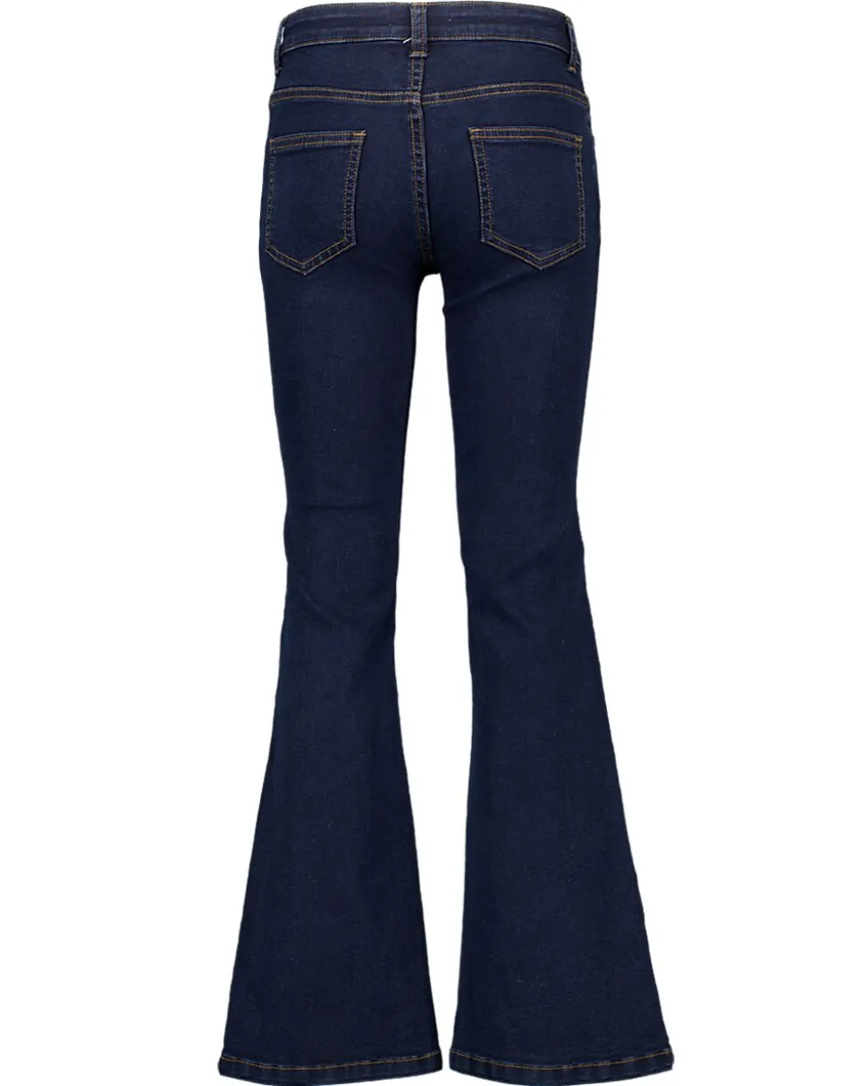 Ce jean bleu pour fille a une coupe évasée avec des jambes larges. Il a une fermeture classique avec un bouton et une fermeture éclair, des poches fendues à l’avant et des poches cousues à l’arrière. Il est fabriqué dans un mélange de coton, polyester et élasthanne, ce qui le rend agréable à porter et offre une bonne liberté de mouvement. Il convient bien à un usage quotidien grâce au tissu résistant et à son style intemporel.