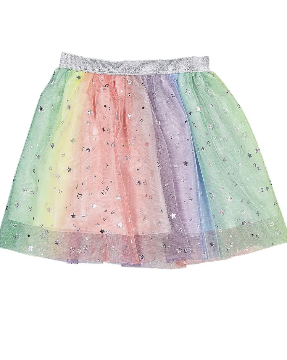Cette jupe convient aux filles. Le modèle a une ceinture élastique argentée qui assure un ajustement confortable. La jupe est faite dans un tissu léger et présente un motif dans des couleurs pastel avec de petites étoiles scintillantes. Grâce à son aspect joyeux, cette jupe est agréable à porter à l’école, lors de fêtes ou pour jouer.