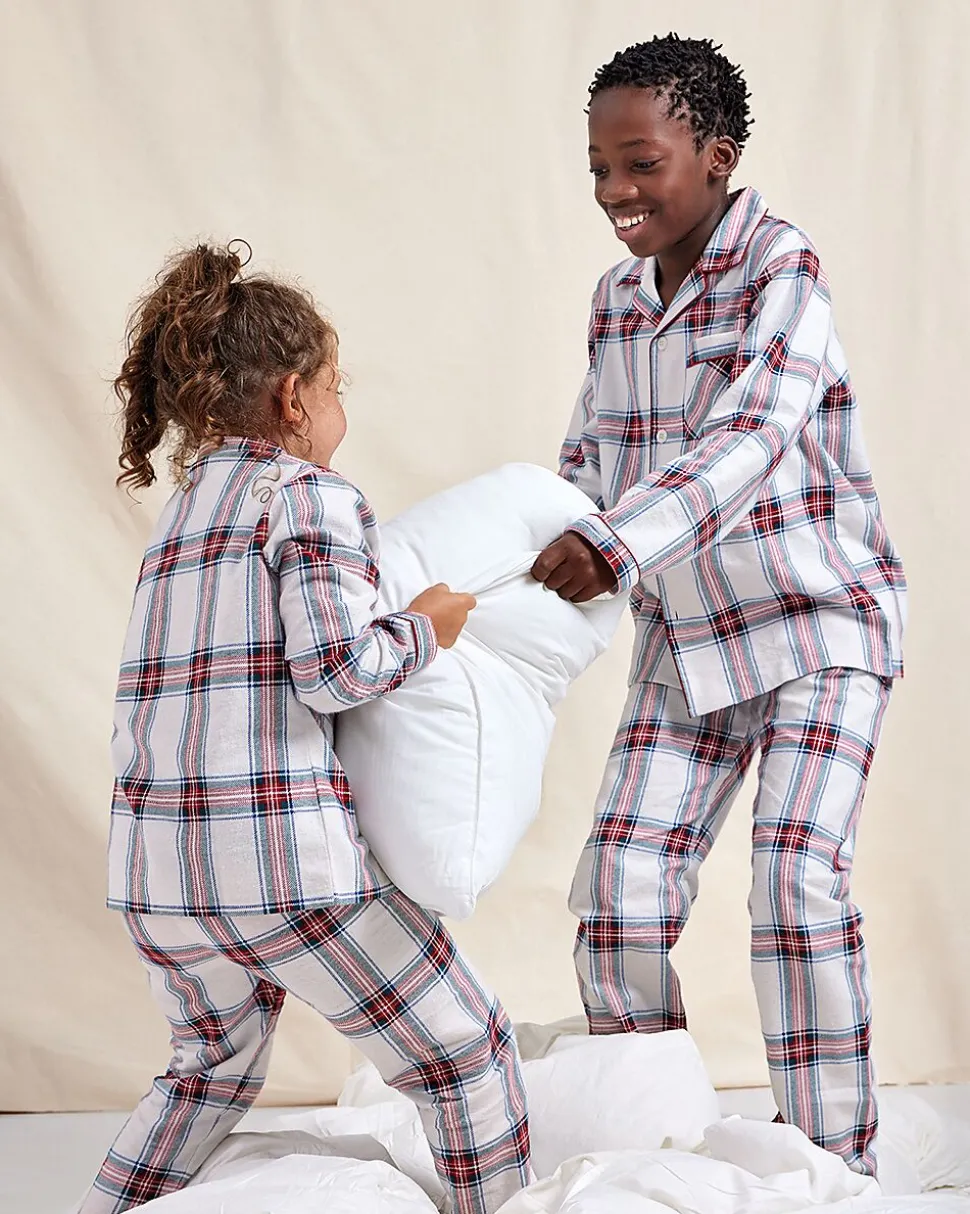 Ce pyjama pour fille est fabriqué en flanelle 100 % coton. Ce tissu est doux et tient bien chaud. Le haut a des manches longues, un col et se ferme avec des boutons. La poche poitrine est pratique pour de petits objets. Le motif à carreaux rouge, blanc et bleu donne un aspect joyeux. Idéal pour les nuits froides.