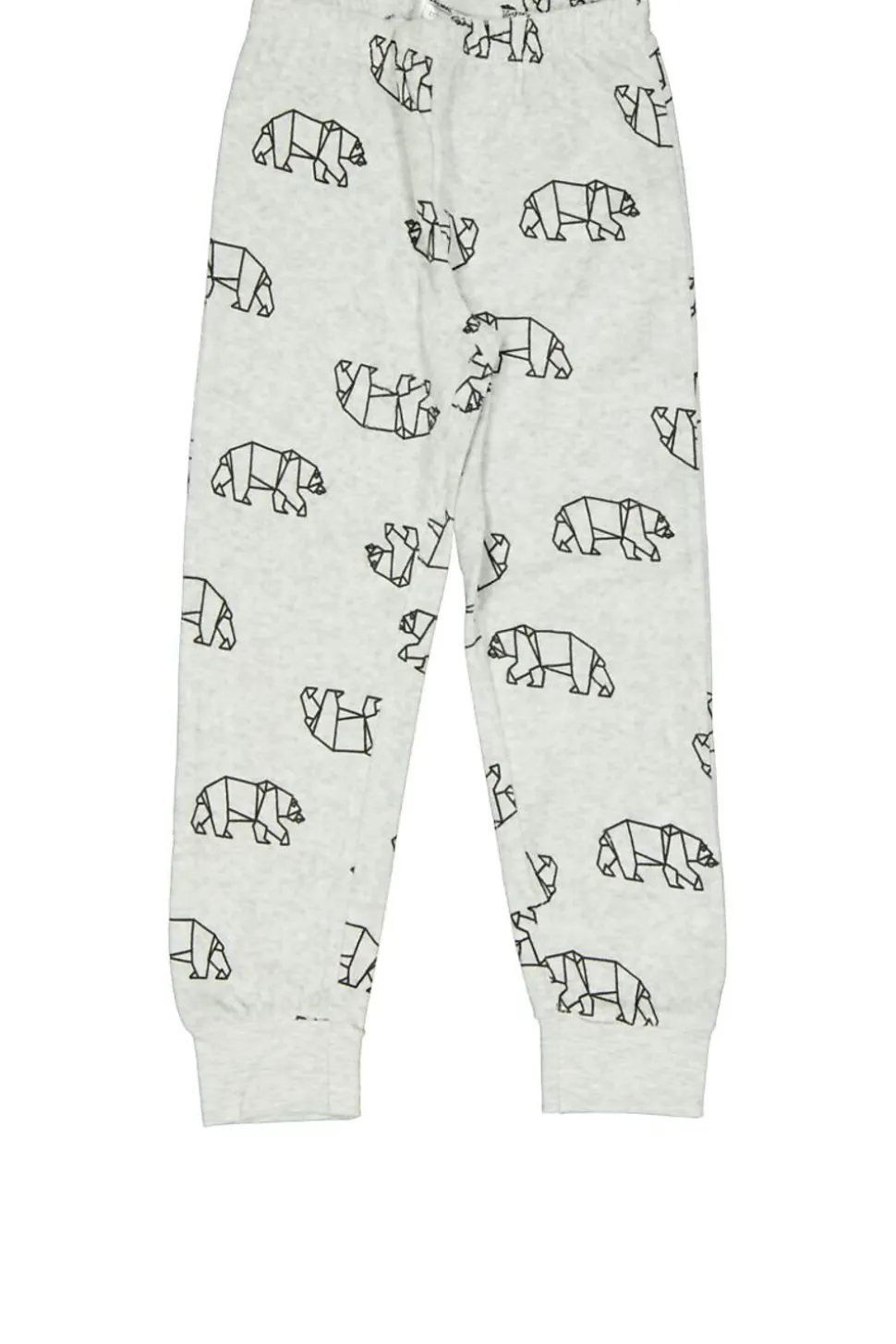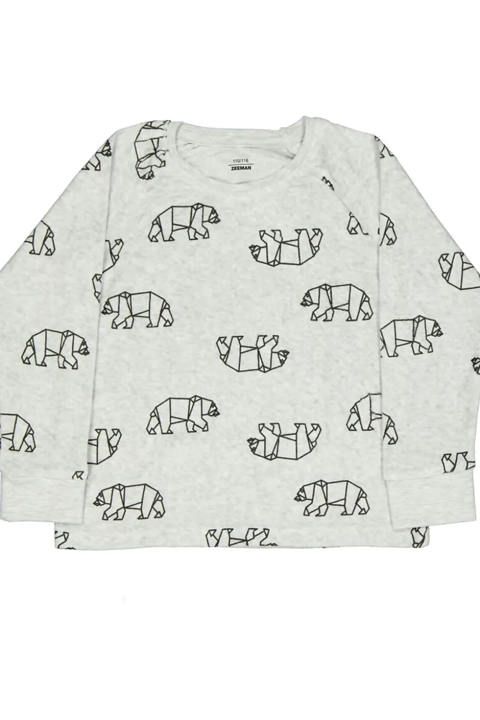 Ce pyjama gris pour garçon est fabriqué en velours doux. L’ensemble comprend un pull à manches longues et un pantalon long. Le tissu est imprimé de motifs d’ours noirs et blancs, ce qui donne au pyjama un aspect ludique. Grâce à l’encolure ronde et aux matières douces, ce pyjama est confortable. Votre enfant peut ainsi bien dormir ou se détendre à la maison.