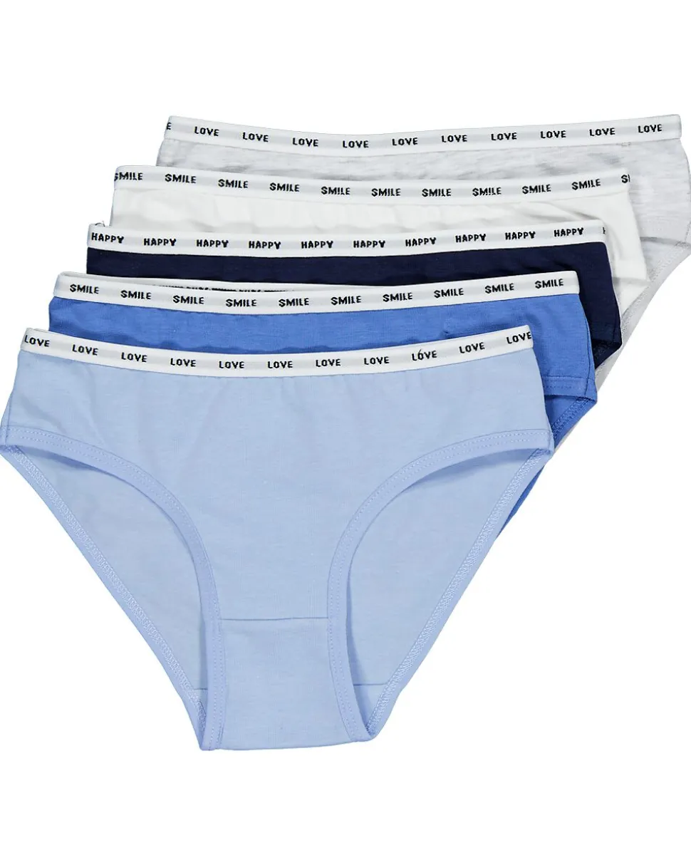Cet ensemble de cinq slips pour filles est proposé dans différentes nuances de bleu et possède une taille élastique avec un motif discret. Les slips s’ajustent bien et n’ont pas de finitions visibles, ce qui les rend agréables à porter sous vos vêtements. Grâce à la matière douce et près du corps, vous restez à l’aise toute la journée. Les couleurs unies donnent un aspect calme et intemporel.