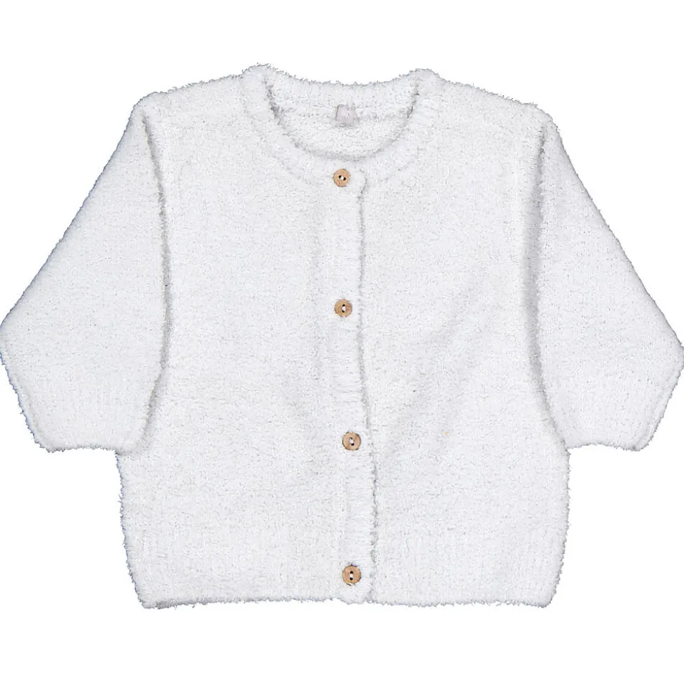 Ce pull pour bébés est fabriqué en fil duveteux doux et possède des manches longues. Le tissu est entièrement composé de polyester et est de couleur gris clair. Grâce à la matière, le pull est souple et doux au toucher sur la peau.
