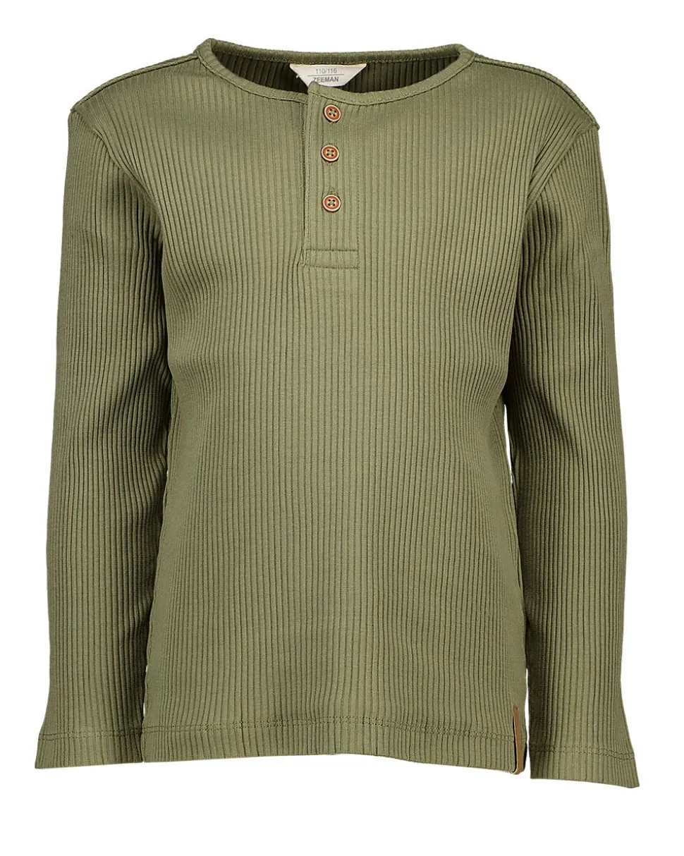 Ce t-shirt pour garçon de couleur verte a une structure côtelée et des manches longues. Grâce à l’encolure ronde avec trois boutons, le t-shirt est facile à enfiler et à enlever. Le tissu côtelé est doux et souple, ce qui permet une bonne liberté de mouvement. Sa couleur unie facilite l’association avec d’autres vêtements.