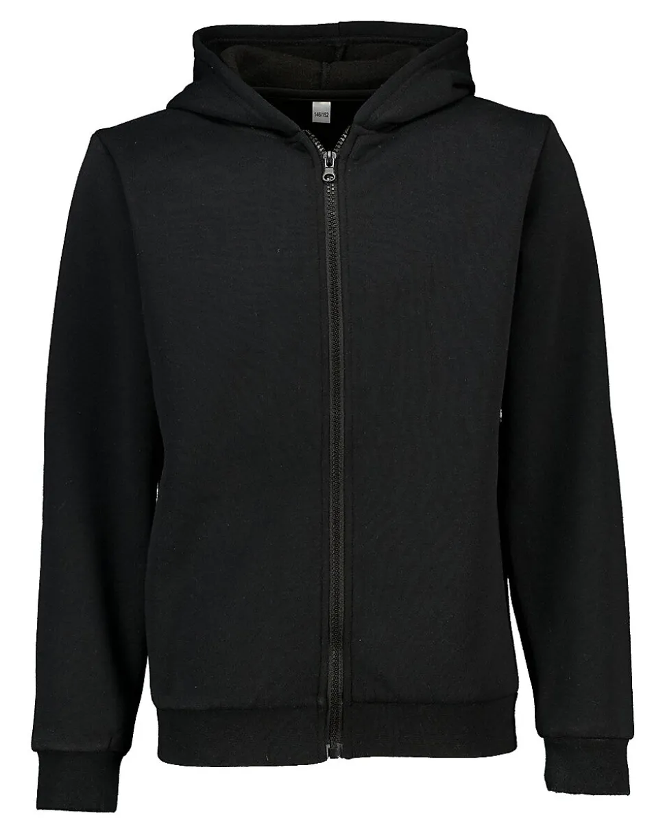 Ce gilet de jogging noir a une capuche, une fermeture éclair sur le devant et des manches longues. Les bords côtelés aux manches et en bas tiennent bien en place pour garder la chaleur. Le tissu est un mélange de polyester et de coton et est doux et souple. Ce gilet convient aux garçons et aux filles et est agréable à porter les jours plus frais.