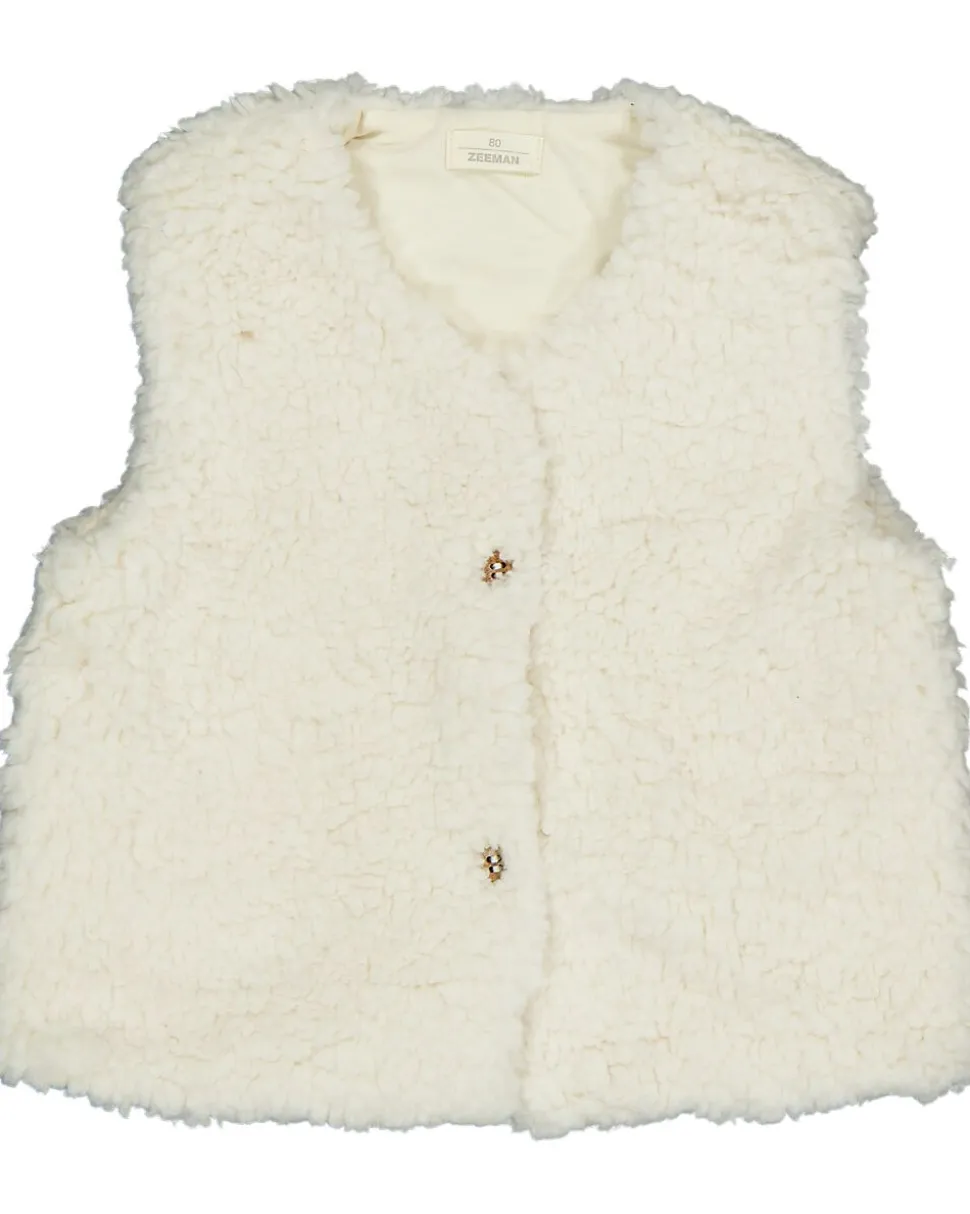 Ce bodywarmer beige pour bébé a un extérieur doux et laineux et se ferme avec deux boutons à l’avant. Le tissu semble confortable et se porte facilement sur un t-shirt ou un pull. Grâce au modèle sans manches, votre enfant peut bouger librement. La finition simple et la couleur neutre en font un ajout pratique au trousseau de bébé.