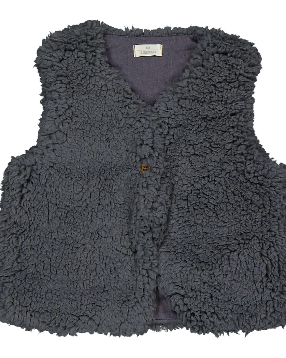 Ce gilet bébé gris est fabriqué dans une matière douce et duveteuse. Il se ferme avec un seul bouton à l’avant. La doublure est lisse et de couleur claire. La finition est simple et confortable, sans poches visibles ni décorations. Le modèle sans manches permet de l’enfiler et de l’enlever facilement par-dessus un t-shirt ou un pull. Idéal pour un peu plus de chaleur.