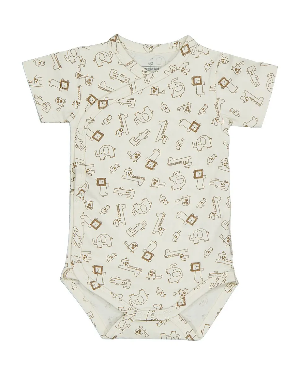 Ce body beige pour bébé est composé à 97 % de coton et 3 % d’élasthanne. Il possède des manches courtes et présente un joli imprimé dans les tons marron et beige. Grâce au tissu doux et légèrement extensible, le body est confortable et laisse une bonne liberté de mouvement à votre bébé. Idéal à porter pour jouer ou dormir.