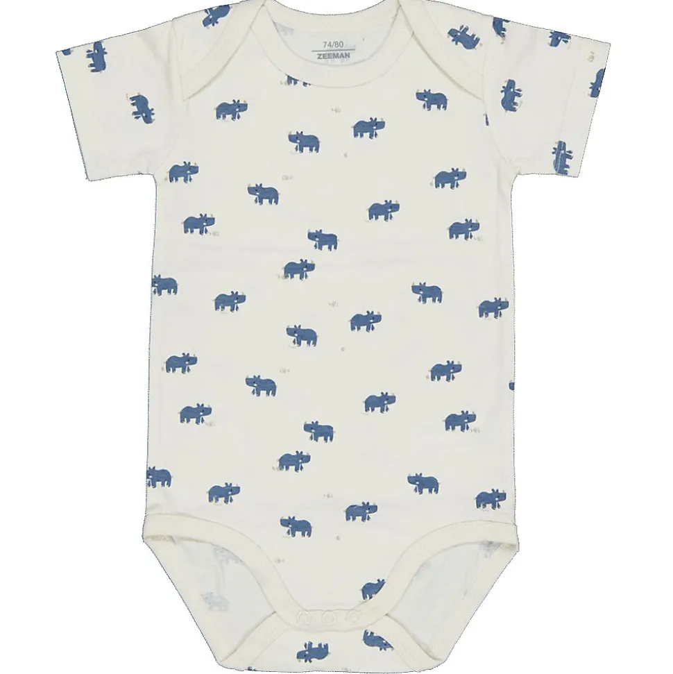 Ce lot de 2 bodys pour bébé comprend un modèle bleu uni et un blanc avec un motif d’animaux bleu. Les manches courtes offrent une grande liberté de mouvement. Le tissu doux est composé à 97 % de coton et 3 % d’élasthanne, ce qui rend les bodys agréables et légèrement extensibles. Ils s’enfilent ainsi facilement et restent bien en place.