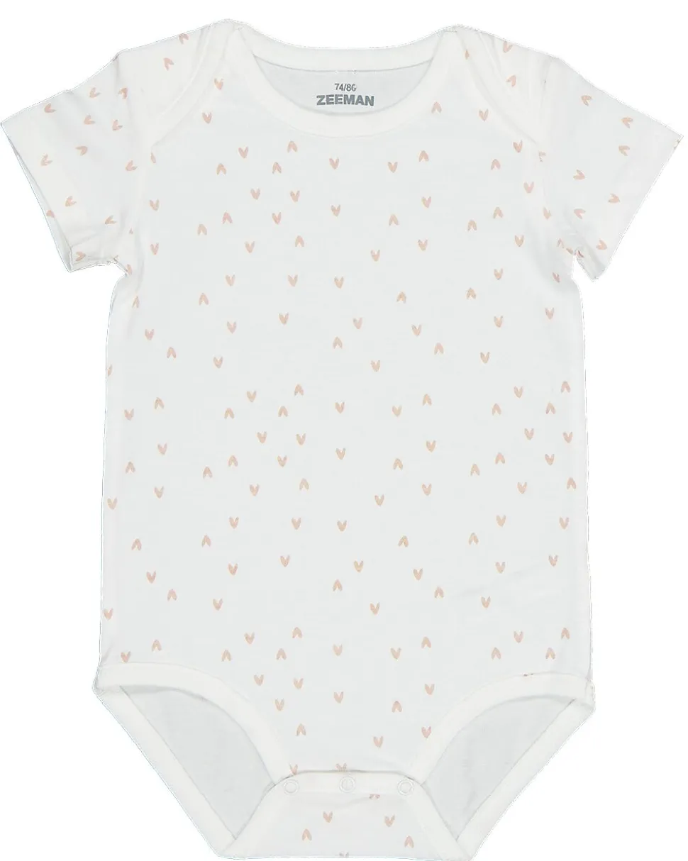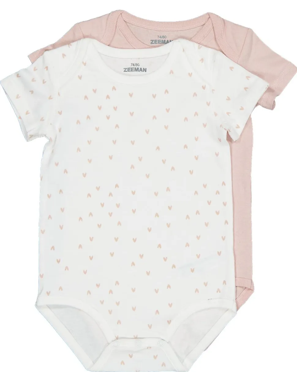 Ce body pour bébé est fabriqué à 100 % en coton et est livré en lot de deux pièces. Un body est entièrement rose, l’autre est blanc avec un imprimé floral rose pâle. Les deux ont des manches courtes et conviennent aussi bien aux filles qu’aux garçons.