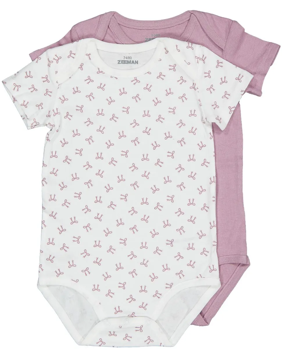 Ces bodies violets pour bébé sont en coton. L’un est uni violet, l’autre est blanc avec un motif violet clair. Les manches courtes et le tissu doux assurent un port confortable, pour que votre bébé puisse bouger facilement. Vous en recevez deux, pour toujours en avoir un propre sous la main.