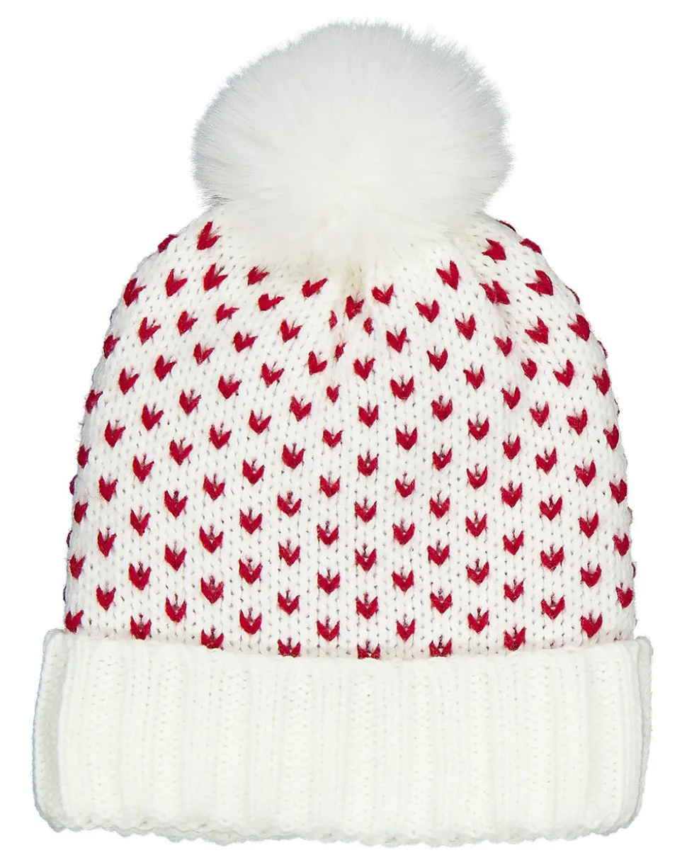 Ce bonnet blanc est orné d’un motif de petits cœurs rouges et d’un gros pompon doux. La structure tricotée solide garde bien la tête au chaud pendant les jours froids. Le revers apporte un confort supplémentaire au niveau des oreilles. Convient aux femmes et aux hommes. Idéal pour passer l’hiver au chaud et en toute simplicité à deux.