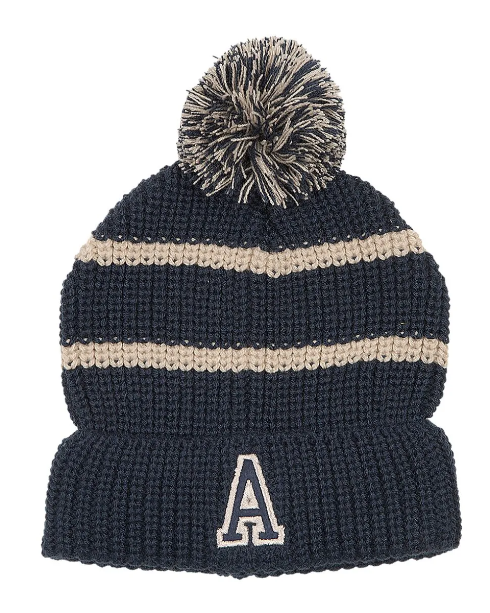 Bonnet tricoté bleu foncé avec deux bandes claires et un gros pompon. Le large revers apporte plus de chaleur pendant les jours froids. Une lettre A blanche est cousue sur le devant, ce qui donne un aspect sportif.