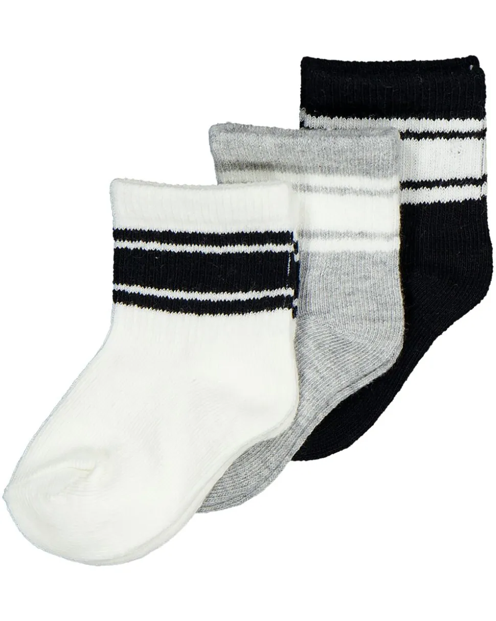 Cet ensemble se compose de trois paires de chaussettes pour bébé, en blanc, gris et noir, avec un motif à rayures. Les chaussettes sont faites dans une matière douce contenant du coton, du polyester recyclé, de l’élasthodiène et de l’élasthanne. Elles sont agréables à porter et légèrement extensibles. Les bords tiennent bien autour des chevilles, ce qui permet aux chaussettes de rester confortables pendant la journée.