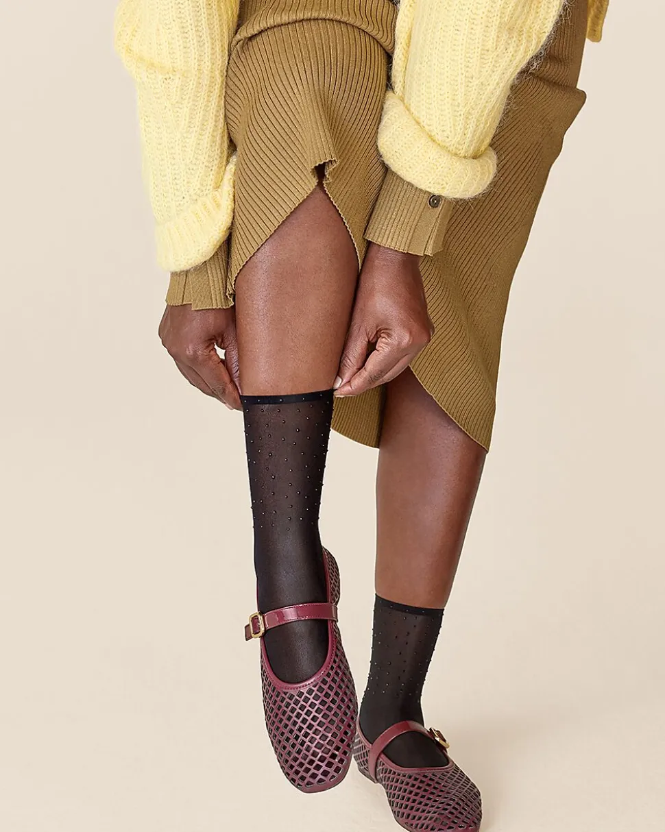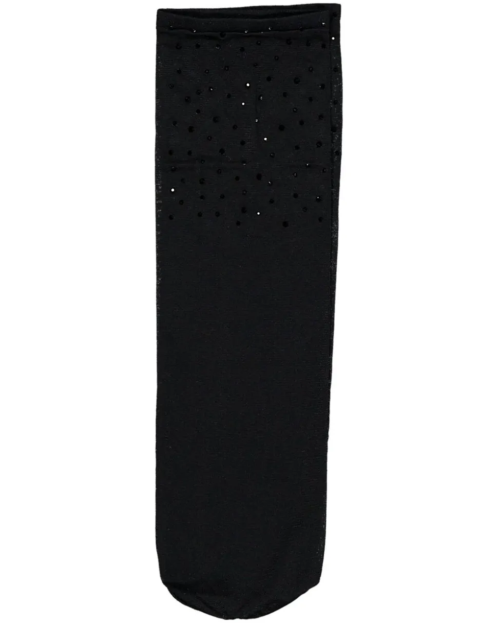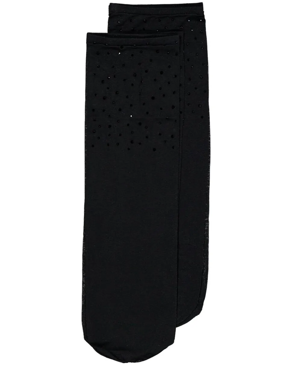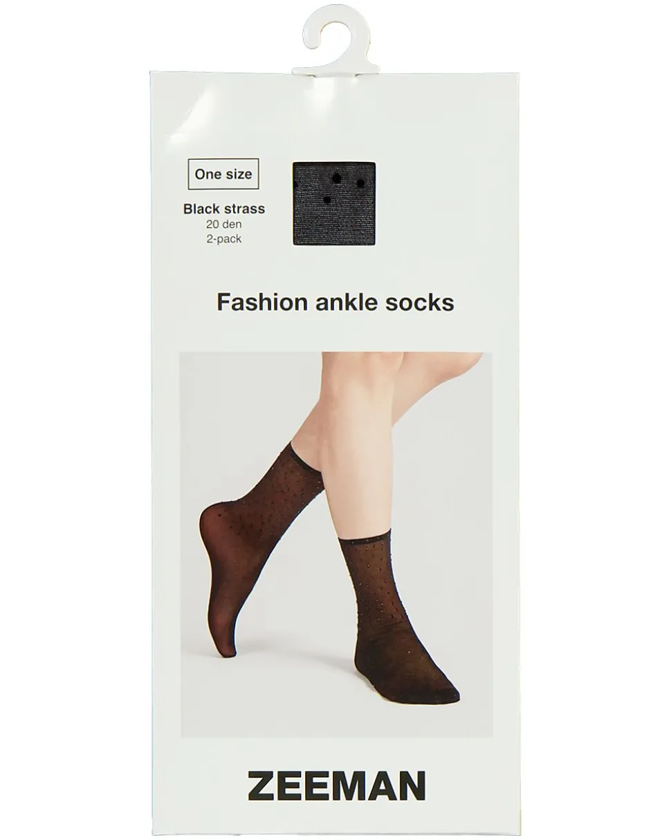 Ce lot comprend deux paires de socquettes noires ornées de strass. Avec une densité de 20 deniers, le tissu est léger et souple, ce qui les rend agréables à porter. La matière est extensible, ce qui permet aux socquettes de bien épouser la cheville et de rester confortables.