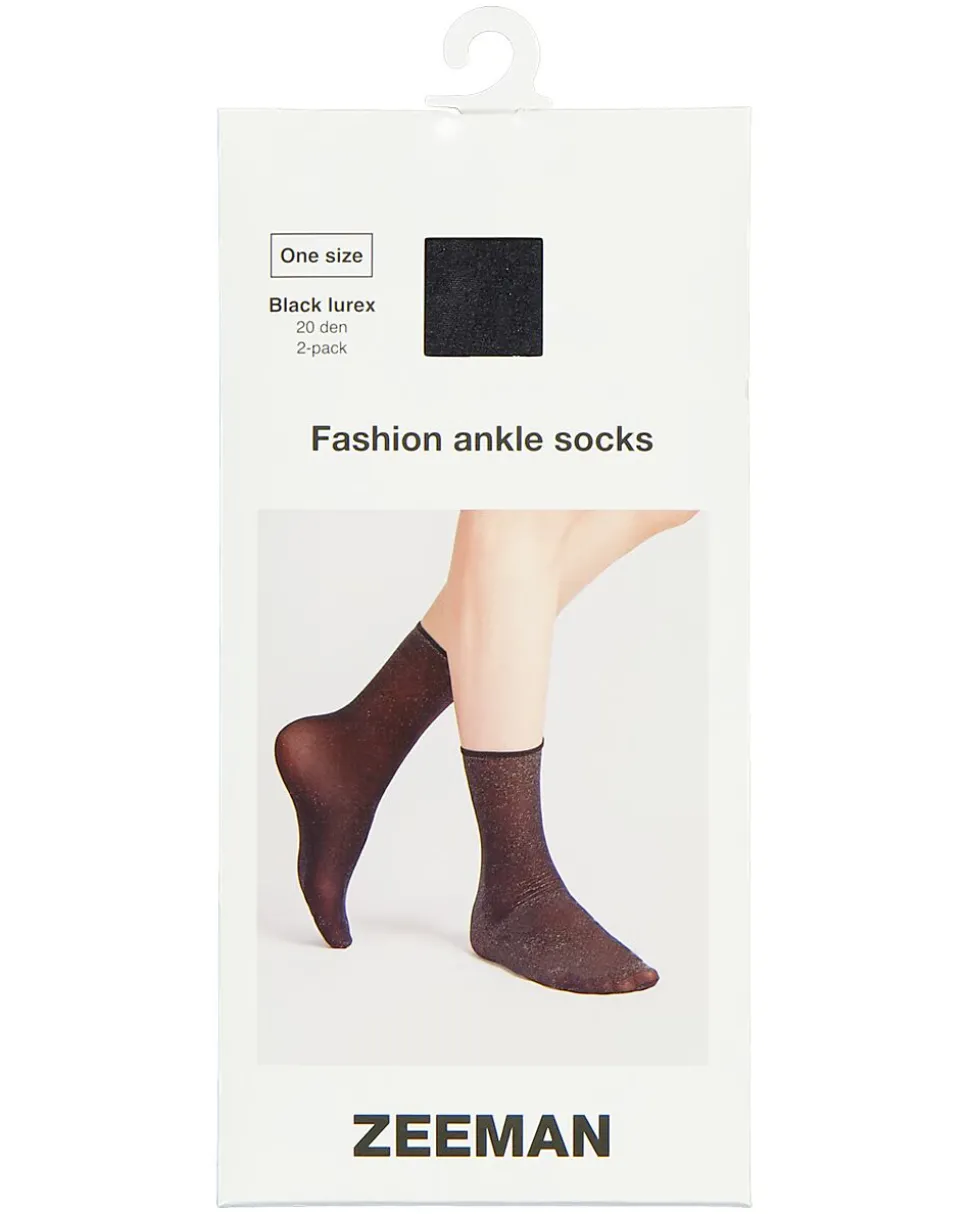 Ce lot se compose de deux paires de socquettes noires pour femme. Les socquettes contiennent un fil pailleté et ont un aspect léger et transparent grâce à la matière 20 deniers. Elles sont souples et épousent bien le pied.