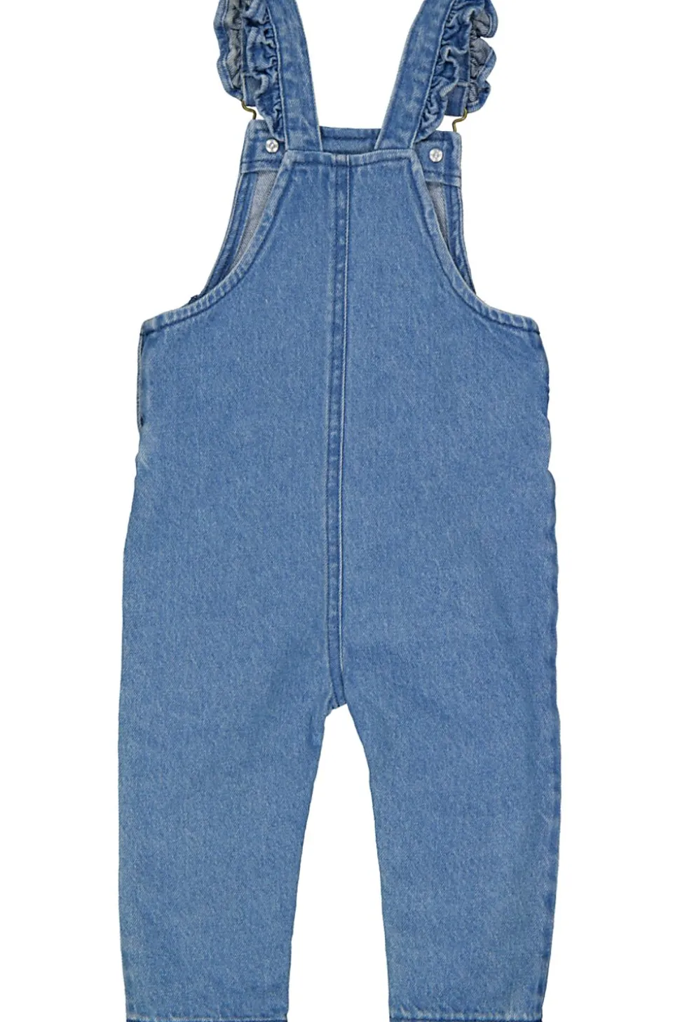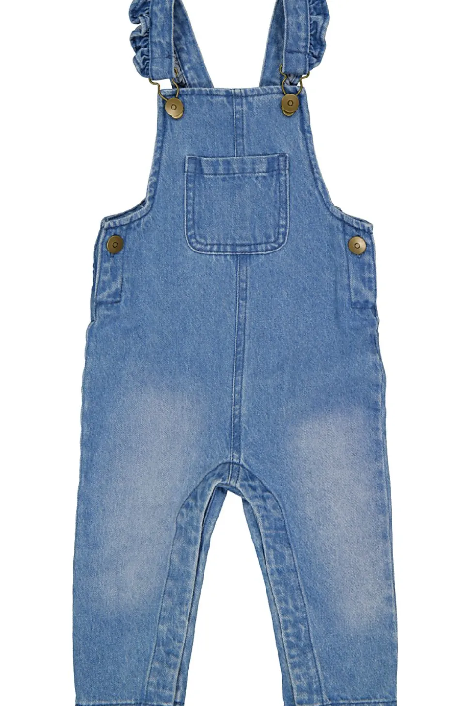 Cette combinaison bébé en denim bleu est faite en 100 % coton, ce qui rend le tissu solide et confortable. Les bretelles avec de petits volants tombent souplement sur les épaules, pour que votre enfant puisse bouger facilement. À l’avant, il y a une petite poche poitrine pour garder un petit objet à portée de main. La coupe droite s’enfile et se retire facilement.