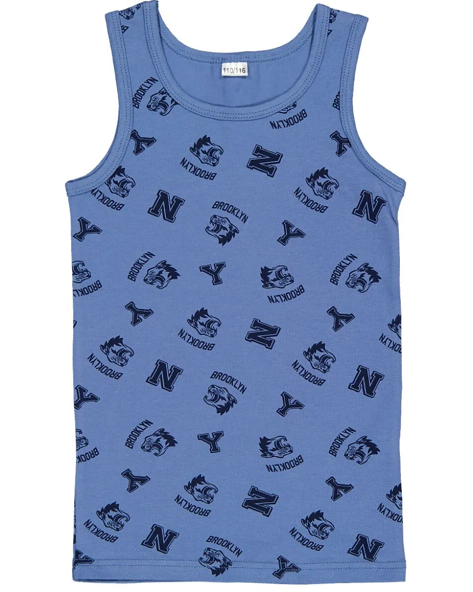 Ce débardeur bleu pour garçon est en coton avec un peu d’élasthanne, ce qui rend le tissu légèrement extensible et agréable à porter. Il a un col rond et un imprimé all-over avec différentes lettres et figures. Le tissu doux est confortable sur la peau, ce qui permet de le porter sous des vêtements ou simplement tel quel.