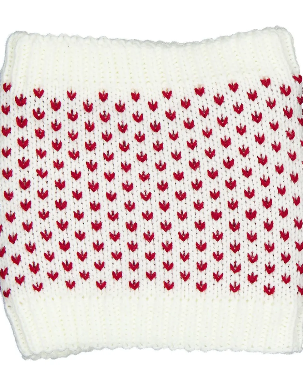 Cette écharpe blanche a un motif tricoté avec de petits cœurs rouges. Le tissu doux est agréable sur la peau et tient bien chaud pendant les journées froides. Cette écharpe se porte facilement avec une tenue d’hiver et apporte du confort quand il fait plus froid dehors.