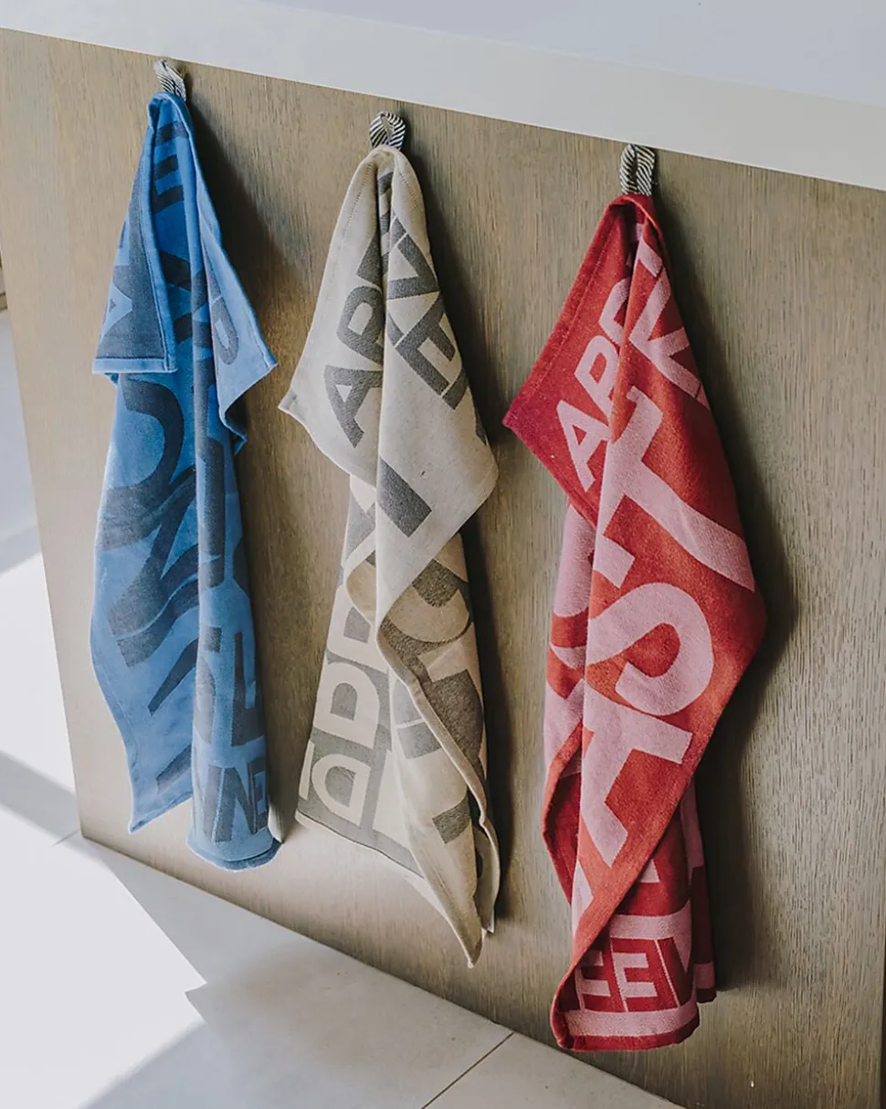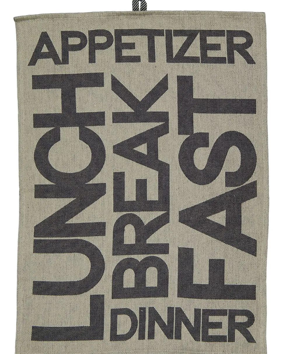 Ce torchon est fabriqué en 100 % coton et présente une structure en jacquard tissé. De grandes lettres avec des mots comme petit-déjeuner, déjeuner, dîner sont imprimées sur le tissu, ce qui apporte une touche ludique et originale dans la cuisine. Grâce à la matière solide, la vaisselle s’essuie facilement. Avec la boucle en haut, vous pouvez facilement suspendre le torchon.
