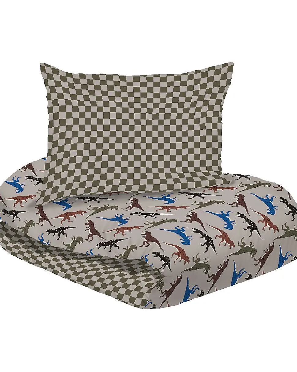 Cette housse de couette a, sur le devant, un imprimé avec différents dinosaures colorés. Le dos et la taie d’oreiller ont un motif à carreaux en gris, brun et bleu. Les couleurs neutres apportent une ambiance calme dans la chambre. Le tissu en flanelle est doux, pour dormir confortablement et au chaud pendant les nuits froides.