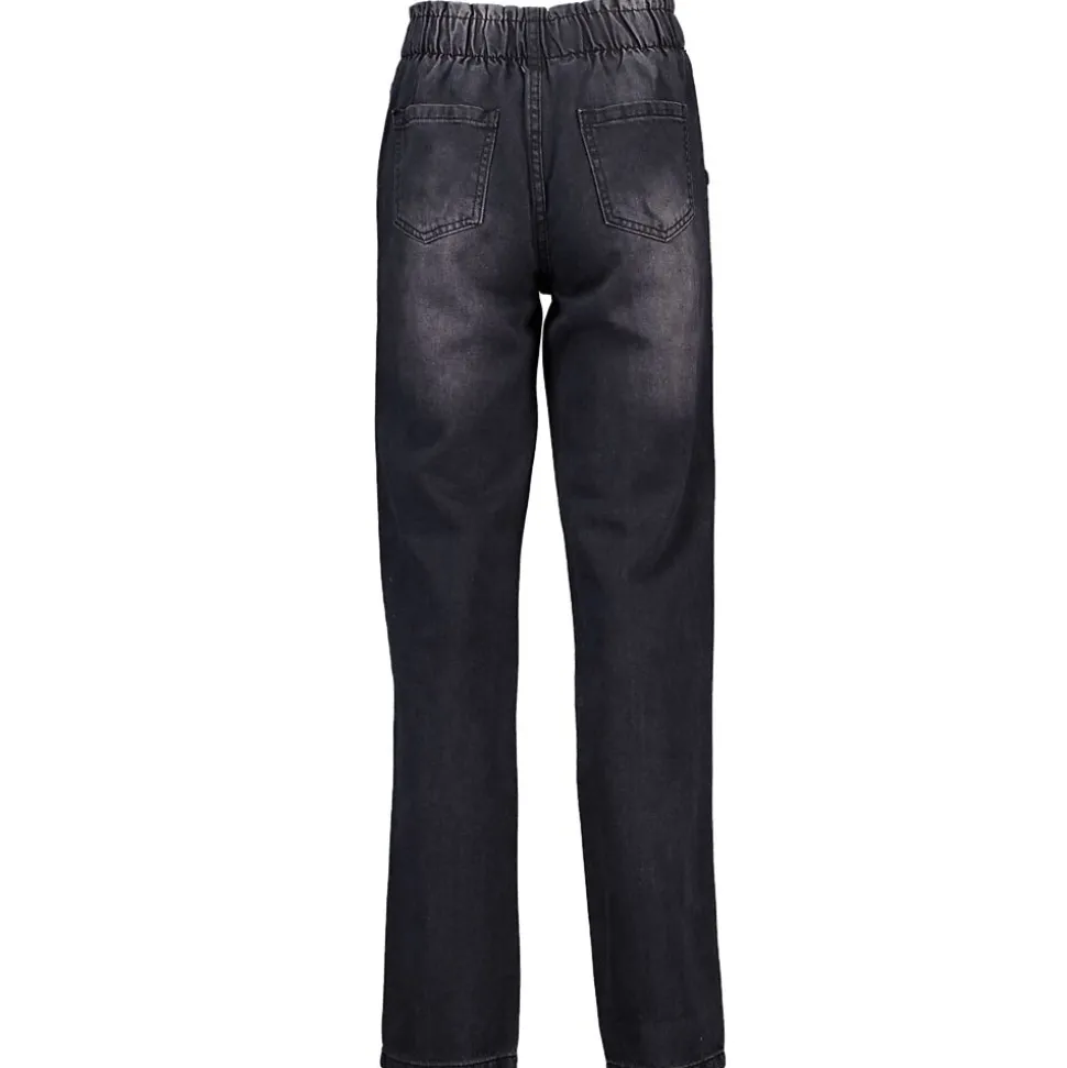 Ce jean noir est confectionné en 100 % coton et présente une coupe droite. Ce pantalon en denim est doté d’une taille élastique avec fermeture à bouton. Aucun motif distinctif ni détail supplémentaire n’est visible. Grâce à sa coupe confortable, ce jean convient parfaitement à un usage quotidien. Il s’associe facilement avec différents hauts.