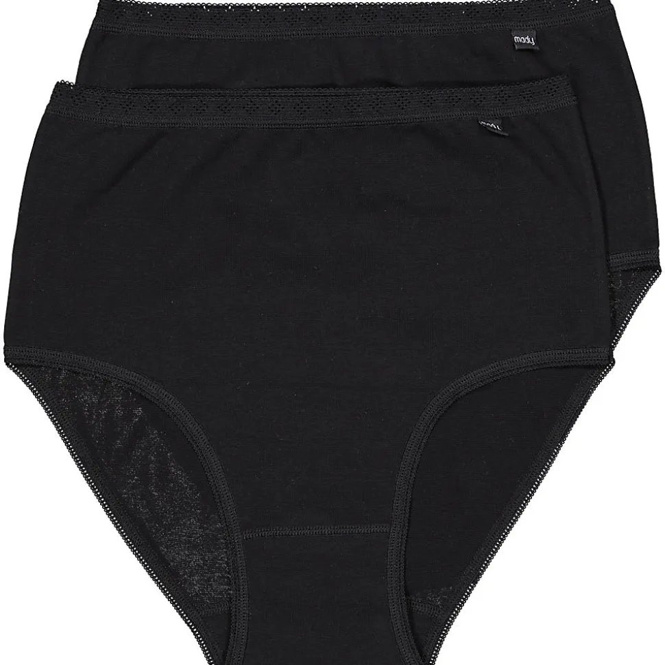 Nos culottes Mady sont populaires depuis de nombreuses années grâce à leur design confortable à taille haute et à leur matière extensible. La culotte remonte bien au niveau de la taille pour un meilleur maintien. La taille élastiquée est large et douce, elle ne serre donc pas la peau et maintient la culotte noire bien en place. Les coutures ont une finition lisse, qui ne frottent pas désagréablement contre la peau. Beaucoup de nos clientes portent également cette culotte comme sous-vêtement de grossesse ou post-accouchement. Le lot contient deux culottes.