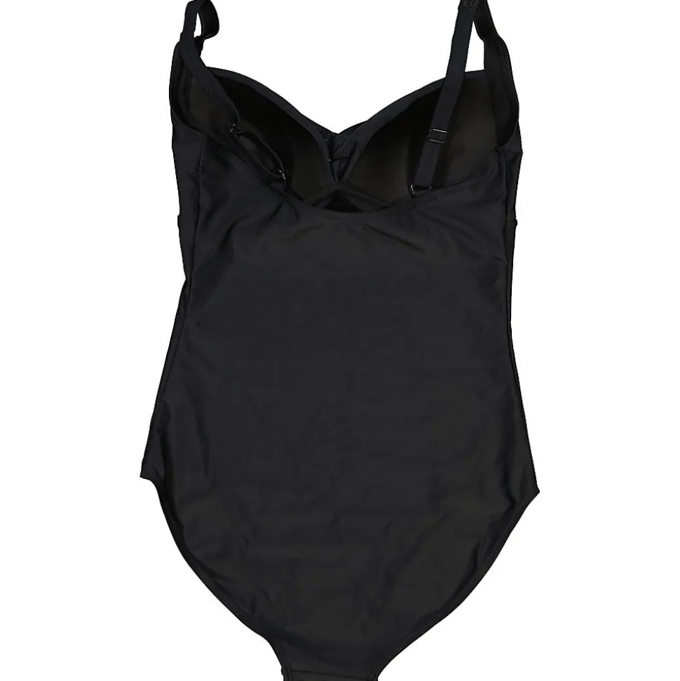 Ce maillot de bain noir pour femme est fabriqué dans une matière lisse et confortable avec de l’élasthanne. La doublure apporte un confort supplémentaire. Le modèle a de fines bretelles réglables pour un ajustement optimal. Les bonnets froncés donnent au maillot un look soigné. La couleur noire classique se combine facilement avec d’autres accessoires.
