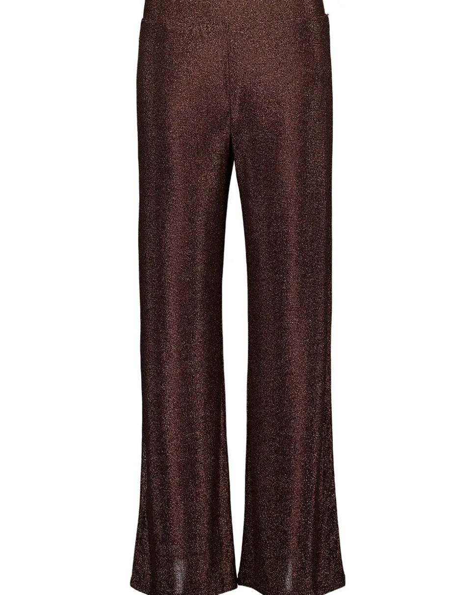 Ce pantalon pour femme est de couleur marron et a une légère brillance grâce au fil métallique dans le tissu. La coupe droite tombe de façon ample autour des jambes, ce qui offre une grande liberté de mouvement. Il n’y a pas de poches, de boutons ou de fermetures éclair visibles, ce qui donne un aspect épuré. Le mélange de polyamide, de fil métallique et d’élasthanne assure un bon confort et une allure soignée. Convient à différentes occasions.