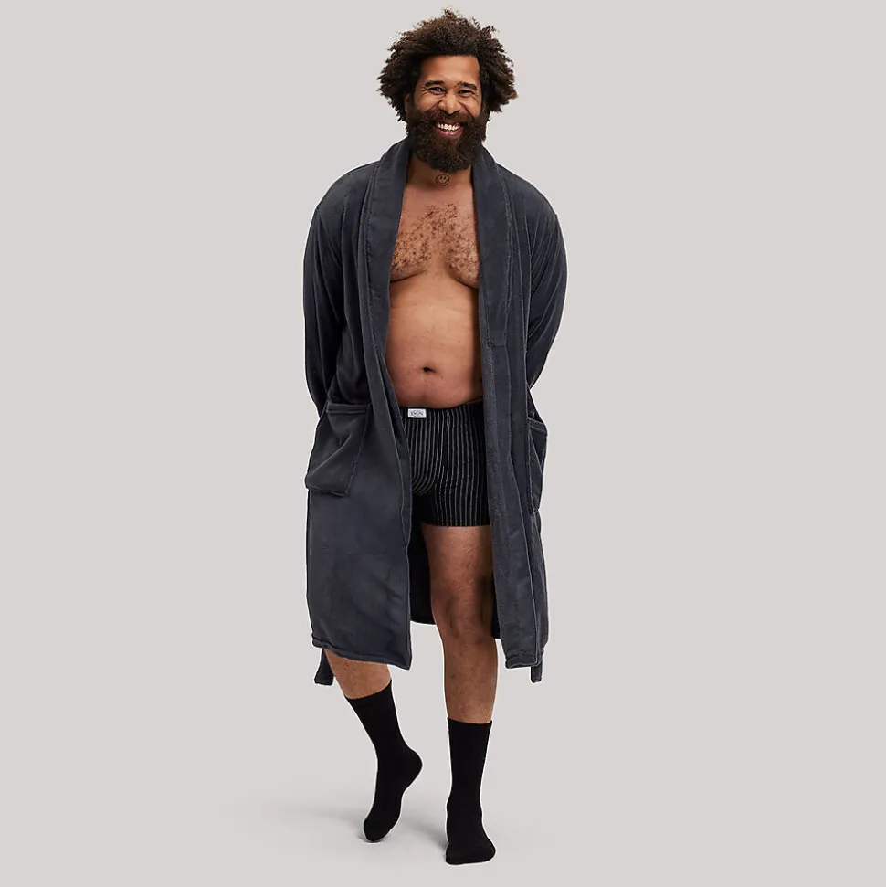 Ce peignoir gris est fabriqué en polaire toucher peluche tout doux. Le tissu est agréablement chaud, légèrement brillant et souple. Cela rend le peignoir agréable à porter. Il descend jusqu’en dessous du genou et présente une coupe droite qui offre suffisamment de liberté de mouvements. Des cordons de serrage à l’intérieur permettent de maintenir les deux côtés bien en place et fermés. Le peignoir se ferme sur l’extérieur à l’aide d’une ceinture. Le col large apporte une chaleur supplémentaire au niveau du cou. Les deux poches sur les côtés peuvent accueillir de petits objets ou vous réchauffer les mains. Et la couleur grise unie s’accorde avec tout. Un basique indispensable pour les soirées sur le canapé ou le petit-déjeuner du dimanche.