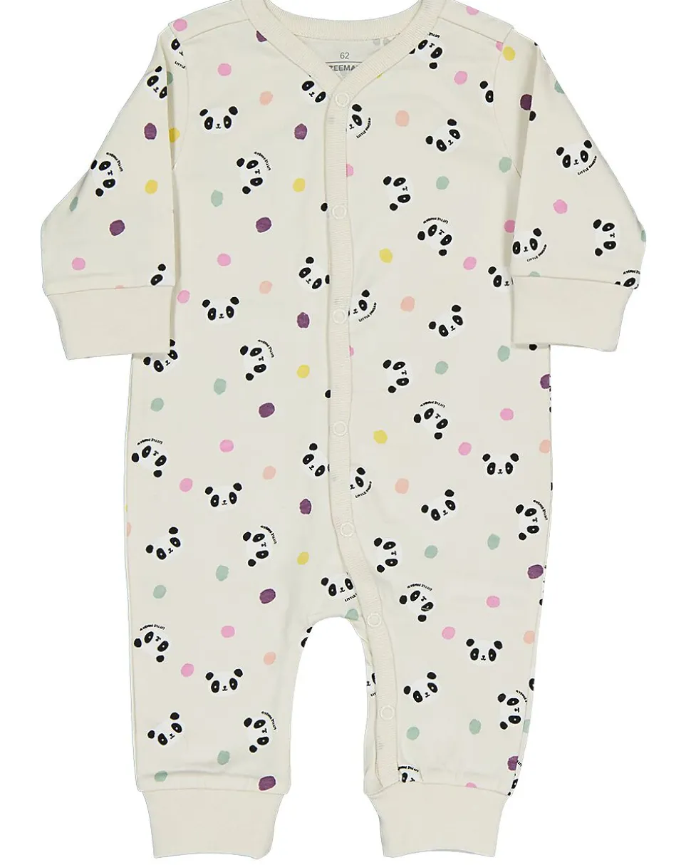 Cette combinaison beige pour bébé a un motif avec de petites têtes de panda et des pois de couleur. Les manches longues et les jambes ont des bords souples pour un bon ajustement. Les boutons-pression vont sur le devant jusqu’en bas, ce qui permet d’habiller et de déshabiller votre bébé facilement. Le mélange de coton avec un peu d’élasthanne est légèrement extensible et agréable à porter.