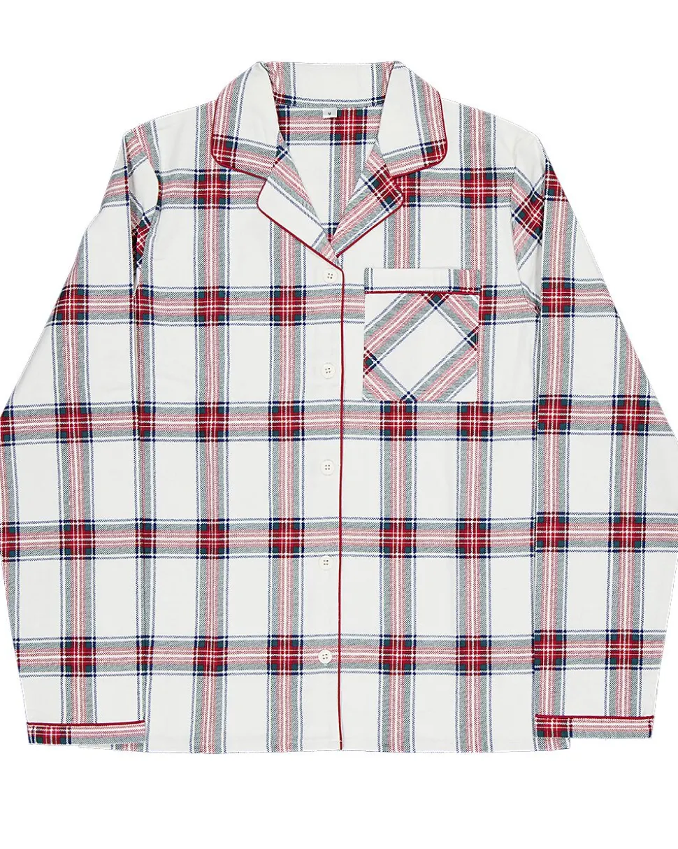 Ce pyjama en flanelle pour femme est fabriqué en 100 % coton. Le tissu est doux et vous tient bien chaud pendant la nuit. Le pyjama présente un motif à carreaux blanc, rouge, bleu et noir. Le haut possède des manches longues, une poche poitrine et se ferme à l’aide de boutons. Le pantalon est doté d’une taille élastiquée et de longues jambes droites. Confortable pour la maison, idéal pour les nuits froides.