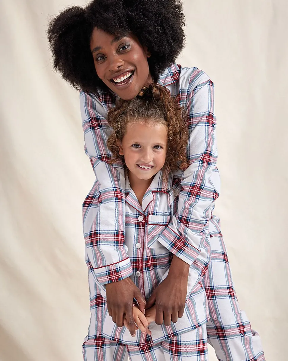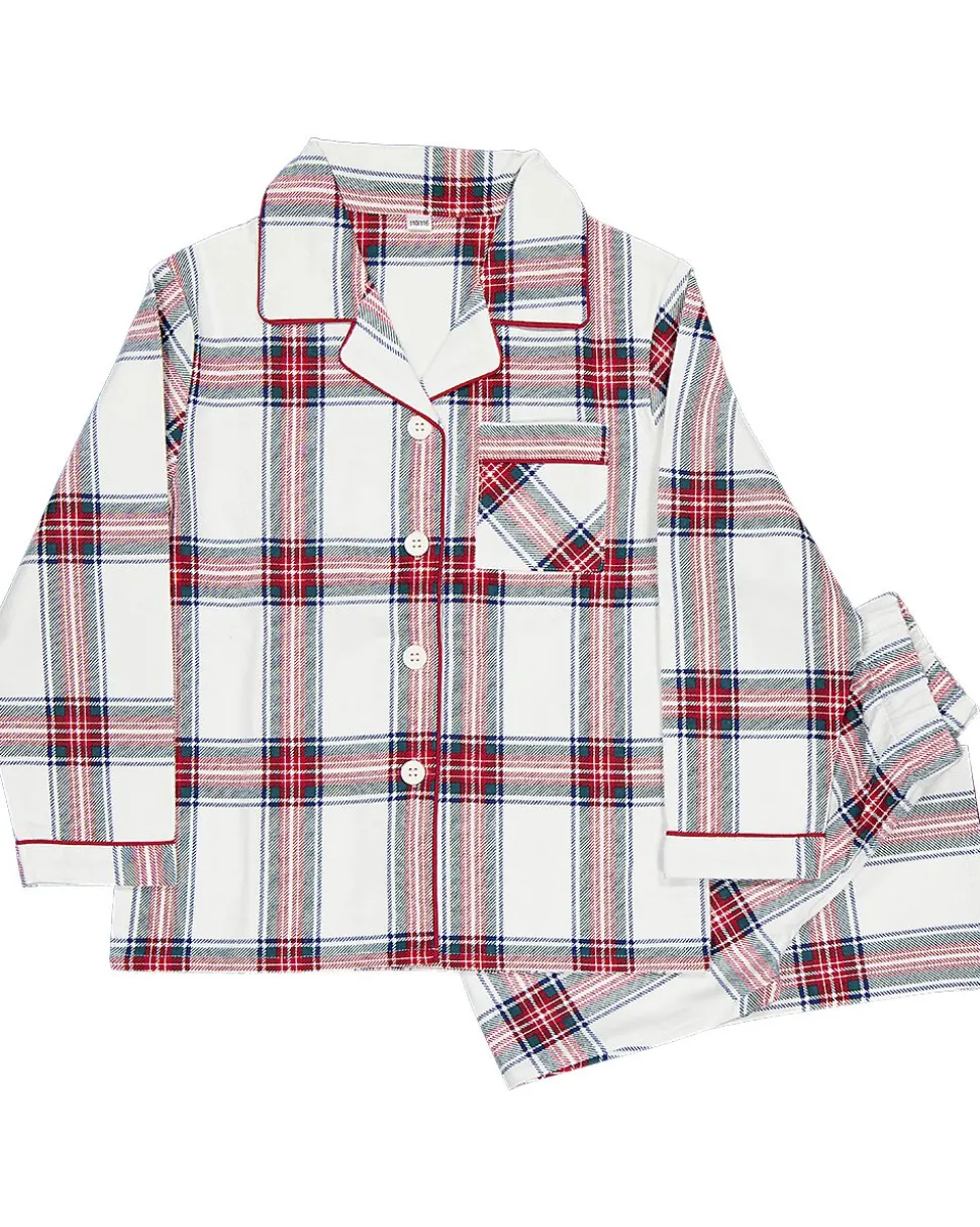Ce pyjama pour fille est fabriqué en flanelle 100 % coton. Ce tissu est doux et tient bien chaud. Le haut a des manches longues, un col et se ferme avec des boutons. La poche poitrine est pratique pour de petits objets. Le motif à carreaux rouge, blanc et bleu donne un aspect joyeux. Idéal pour les nuits froides.
