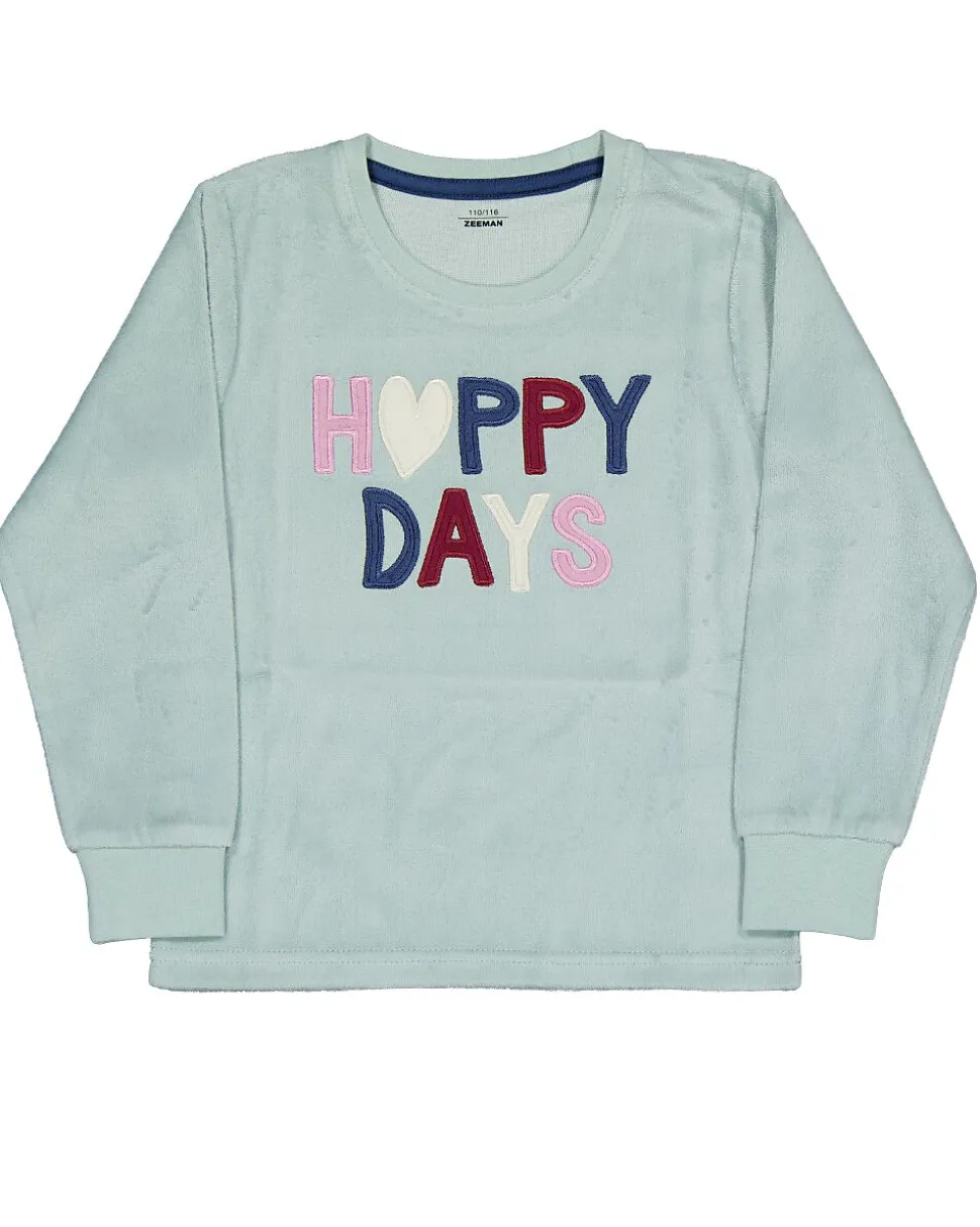 Ce pyjama pour fille est en velours doux et a un col rond et des manches longues. Le haut a un texte coloré et joyeux. Le pantalon long présente un motif rayé foncé. Grâce au tissu doux, le pyjama est agréable à porter et convient pour dormir ou se détendre confortablement, surtout lors des journées plus froides.