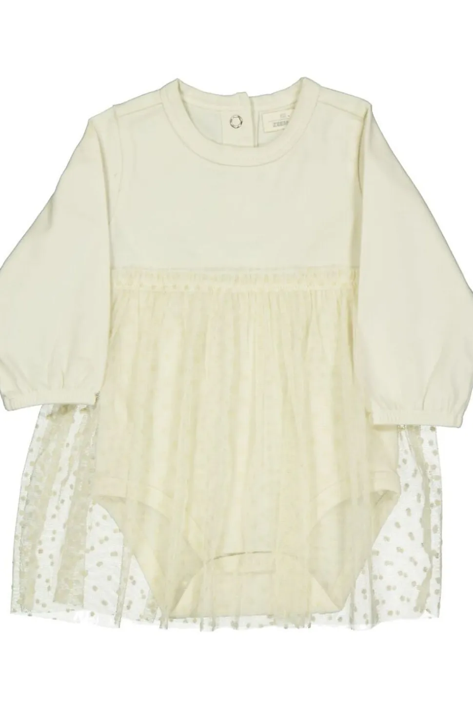 Cette robe bébé beige a des manches longues et un col rond, pour que votre bébé reste bien au chaud. Le petit bouton dans le dos permet de l’enfiler et de l’enlever facilement. La jupe est finie avec un tissu léger et légèrement transparent à pois, ce qui donne une coupe aérée. Grâce au jersey simple et souple, la robe est confortable pour votre bébé.
