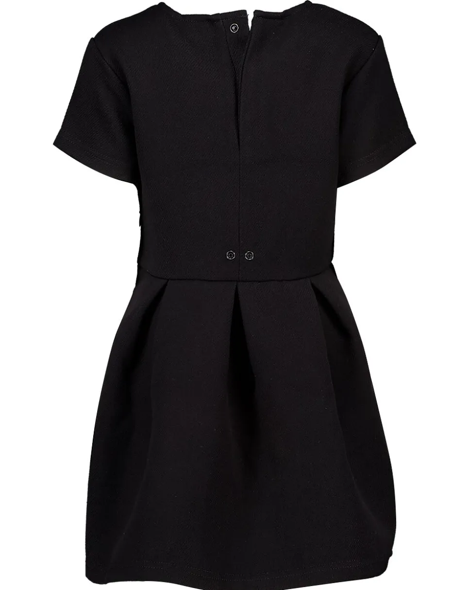 Cette robe noire pour fille a des manches courtes et une encolure ronde. Le haut est ajusté grâce à un petit bouton au dos et la jupe est un peu plus large à cause des plis à l’avant. Au dos de la robe, il y a un nœud noir que vous pouvez aussi enlever. La robe est facile à assortir et convient pour différentes occasions, comme une fête.