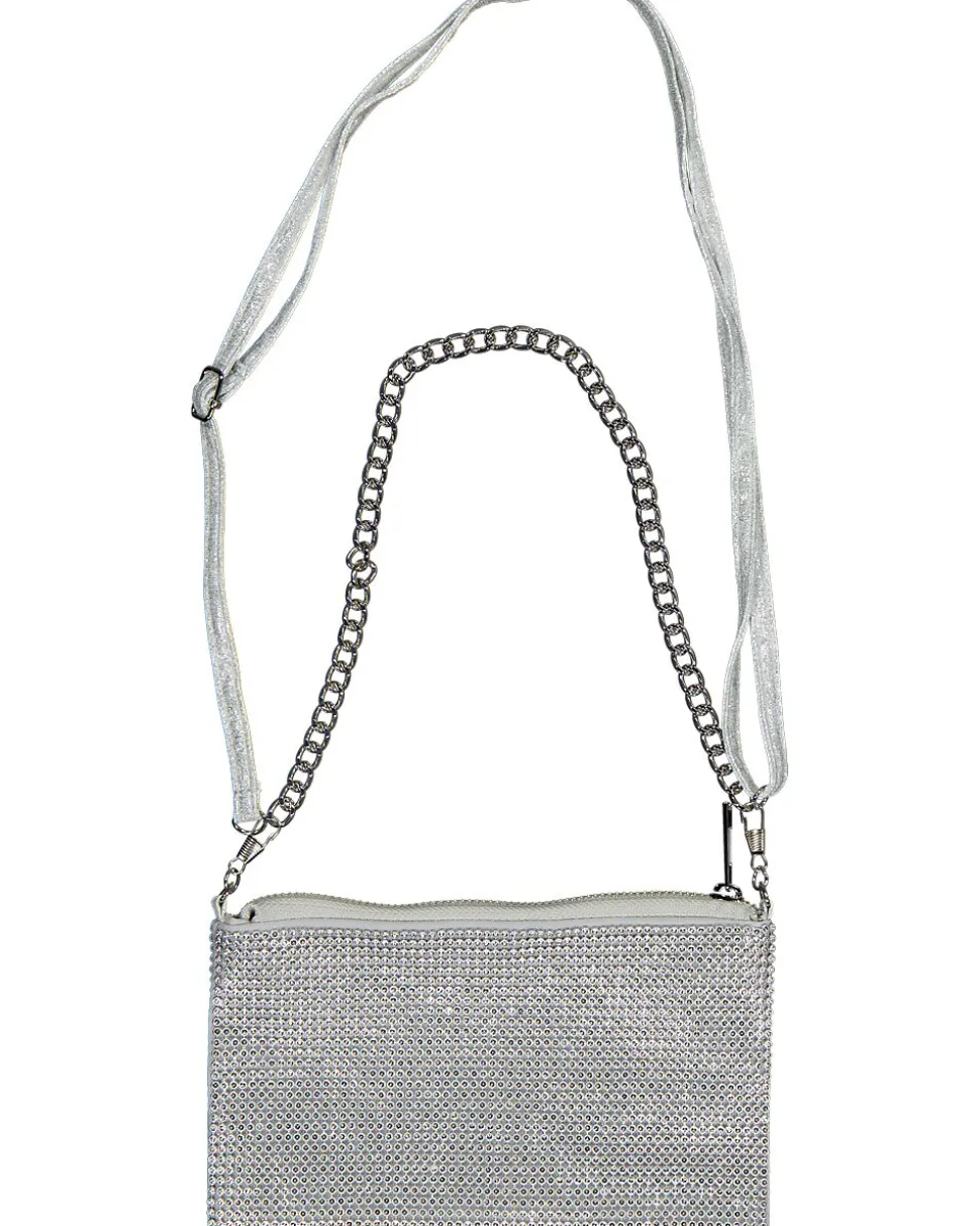 Ce sac argenté pour femme est fabriqué à partir d’un mélange de plastique, de polyester et de fer. Le sac a un extérieur brillant avec de petits strass et possède une bandoulière réglable ainsi qu’une chaîne en métal. Grâce à la fermeture éclair, vos affaires restent bien rangées. Pratique à emporter pour une fête ou une soirée.