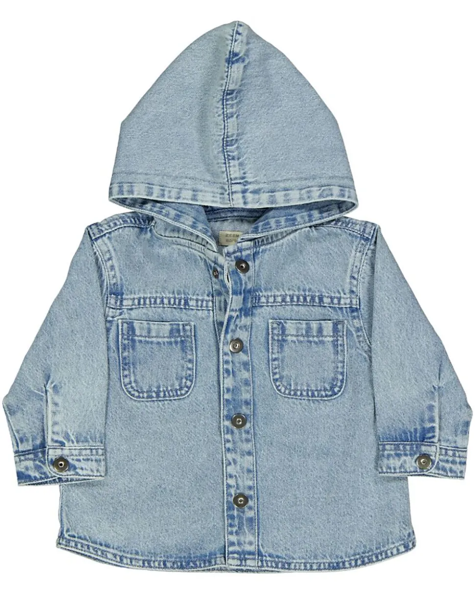 Cette veste bleu denim pour bébé a une capuche et se ferme avec des boutons à l’avant. Les manches longues tiennent chaud, pour que votre bébé ait bien chaud les jours plus frais.