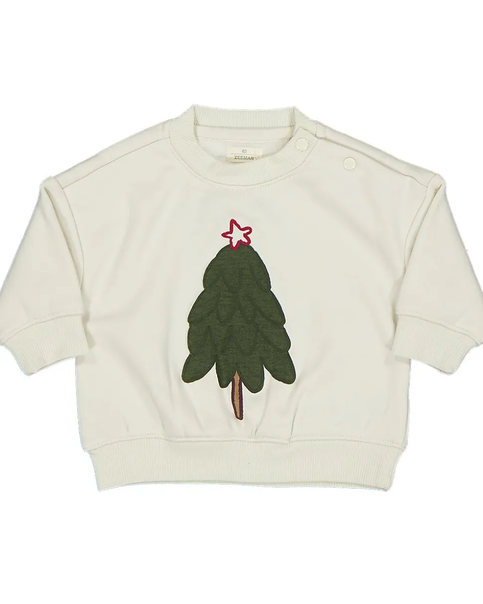 Ce sweat beige pour bébé est fabriqué dans un tissu doux à l’intérieur, ce qui le rend confortable à porter. Le pull a des manches courtes et un col rond. Sur le devant, il y a une application d’un sapin vert avec une petite étoile rouge. La large bordure en bas assure une bonne tenue. Convient pour un usage quotidien.