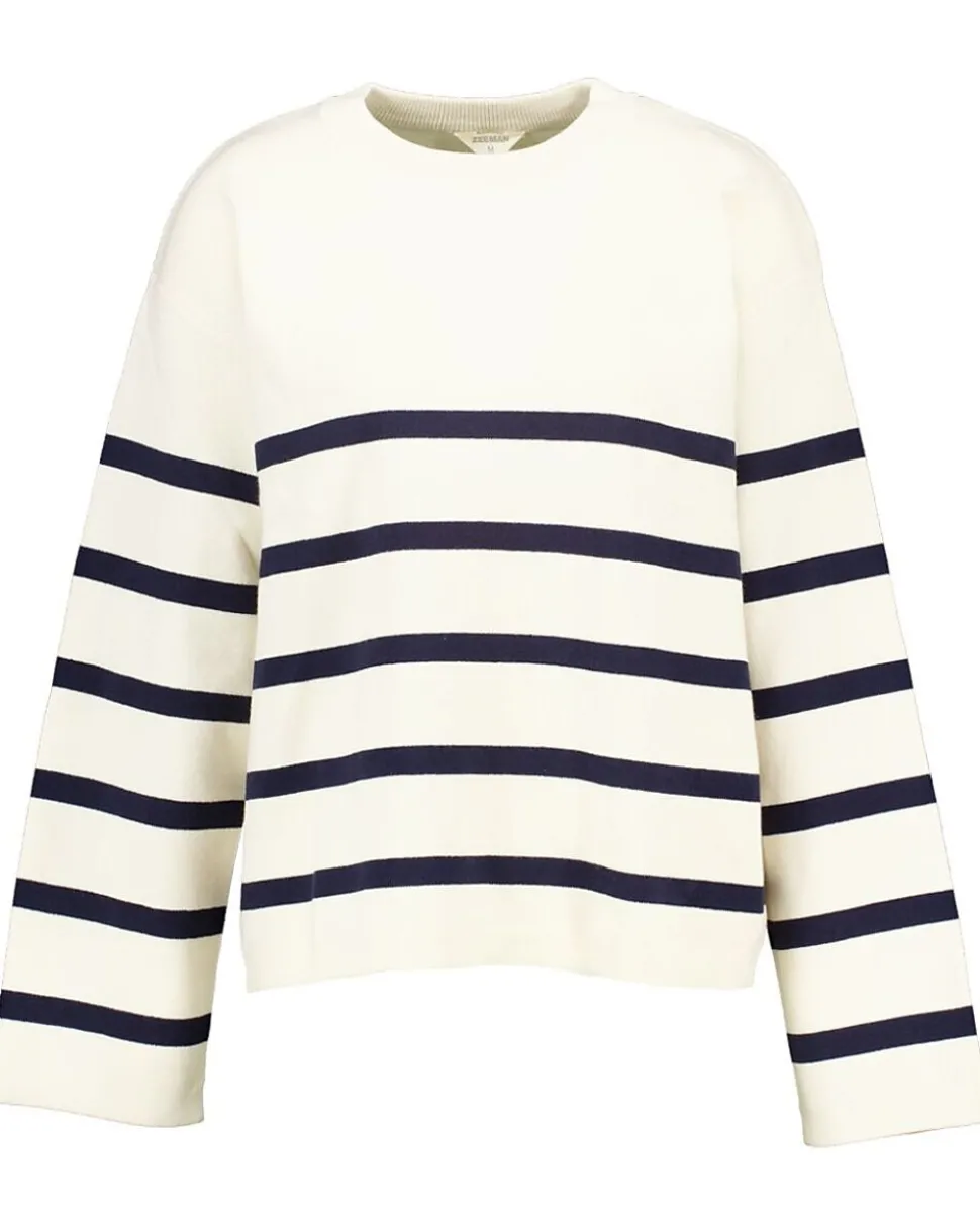 Ce pull pour femme est beige avec des rayures bleu foncé. En maille et doté de manches longues, il est doux sur la peau et offre un tombé fluide. Grâce à son col rond, il épouse parfaitement le cou. La présence de coton dans sa composition rend le pull confortable à porter toute la journée.