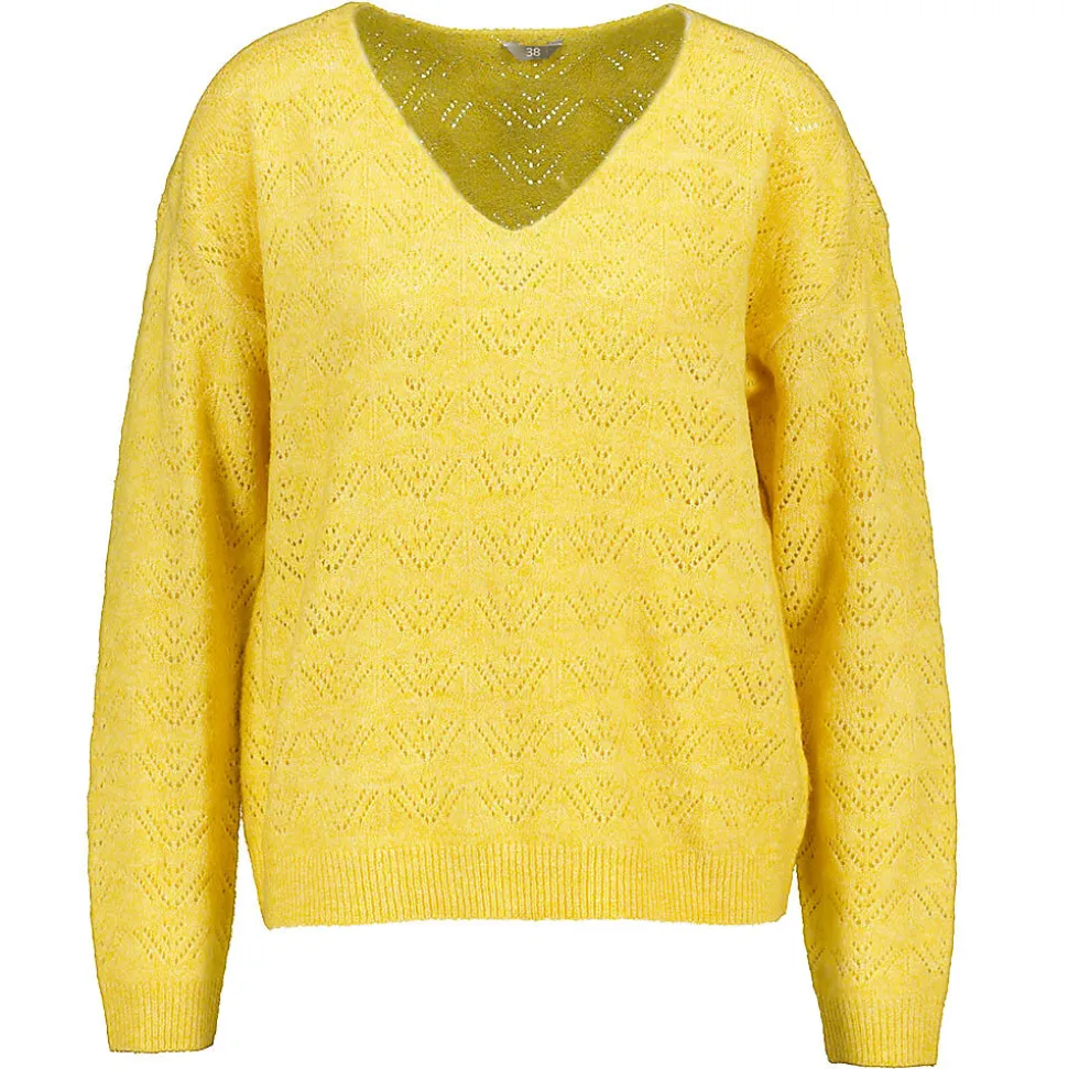 Ce pull jaune pour femme présente un motif ajouré, un col V et des manches longues. Le tissu est léger et extensible grâce à sa composition mêlant acrylique, polyester et élasthanne. Sa matière le rend confortable à porter et offre une grande liberté de mouvement. Idéal pour porter quelque chose de chaud lors des journées fraîches.
