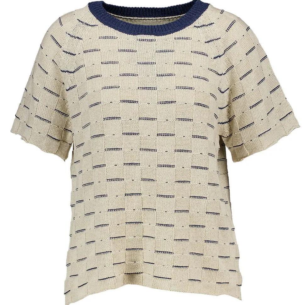 Ce pull blanc cassé à fines mailles présente un motif ajouré et des manches courtes. Le col rond contrastant est bleu foncé. Le pull est fabriqué à partir de diverses matières recyclées, dont l’acrylique et le coton. Également disponible en bleu foncé.