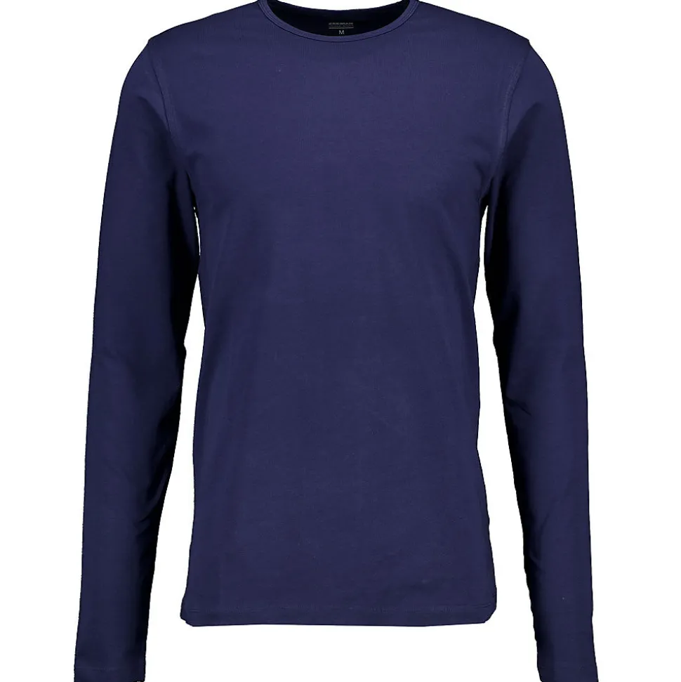 Ce T-shirt bleu foncé pour homme a des manches longues et un col rond. Le tissu est composé de coton, de coton recyclé et d’élasthanne, ce qui rend le T-shirt doux au toucher et légèrement extensible. Sa couleur unie permet de l’associer facilement à différents pantalons. Le jersey simple rend le T-shirt souple et confortable, pour un porté agréable au quotidien.